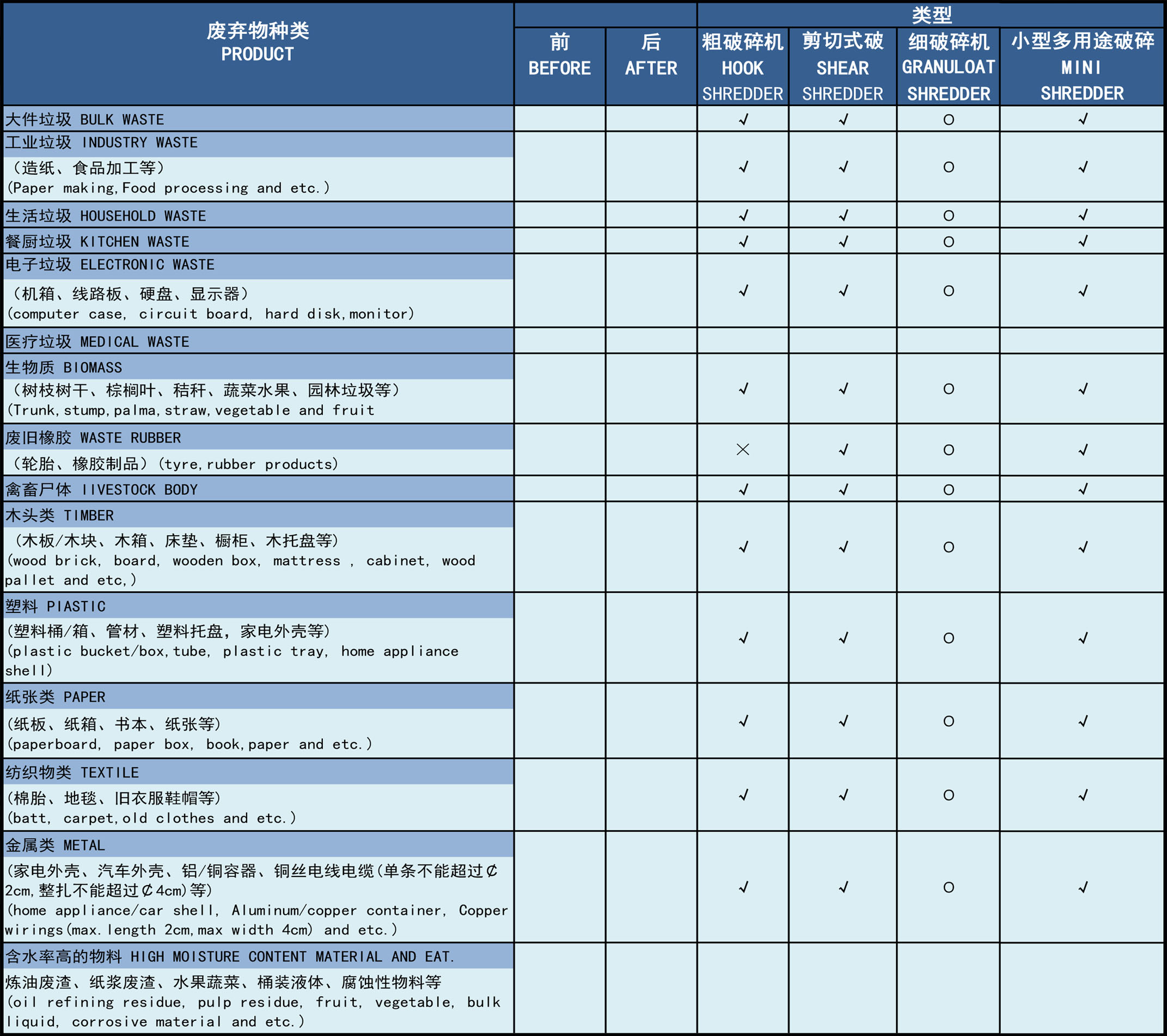 環(huán)創(chuàng)破袋機(jī)(粗破碎機(jī)),低轉(zhuǎn)速,大扭矩,用于破碎生活垃圾、大件垃圾、工業(yè)垃圾、廢舊木材等,將大件的垃圾破碎成200*250mm的碎塊,廣泛用于垃圾衍生物料生產(chǎn)和垃圾焚燒發(fā)電等領(lǐng)域的初步破碎,處理量大,維護(hù)成本低,可靠性好。整套設(shè)備包括電機(jī)、減速機(jī)、兩組刀片軸、料斗、支架、PLC控制柜等組成。它通過(guò)兩組動(dòng)刀軸相向旋轉(zhuǎn),與定刀合力剪切、撕扯、擠壓來(lái)減小物料的尺寸。該機(jī)型處理量極大,每小時(shí)處理量從10噸到100噸可選。物料的碎后粒徑200*250mm。